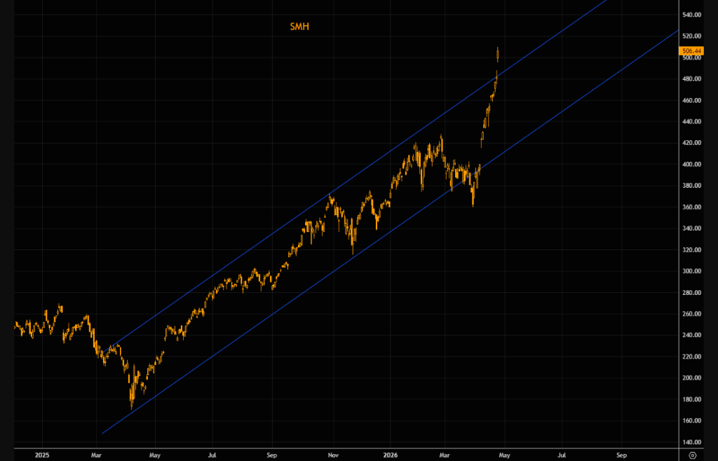 例如,追踪半导体股的ETF SMH,其5月480/430看跌期权价差,当前最大收益约为6.25倍,而下方行权价对应的是仅仅11个交易日前的价格水平。