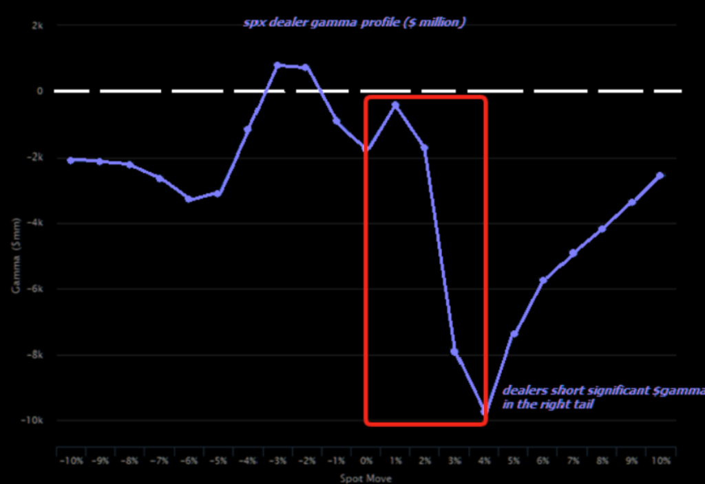 然而,需注意到当前市场右尾的脆弱性。一旦指数再上涨2%至4%,做市商将进入激进的Short Gamma区间。也就是说,做市商的对冲方向会从“稳定器”切换为“加速器”,股价涨他们追买,跌了又被迫追卖,波动因此被放大。上涨本身,正在为下一次无序波动埋下引线。
