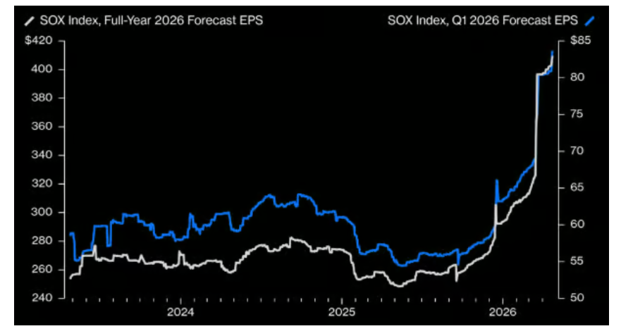 预期垂直拉升,SOX的盈利预测不只是在上调,而是在追着股价往上跑。