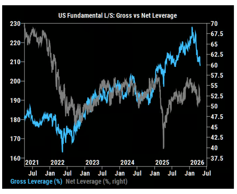 上周美国多空基金总杠杆率下降4.6个百分点,美股经历了七个月来(自2025年9月以来)最大规模的名义去杠杆,主要由个股风险平仓驱动。11个板块中有9个录得净卖出。