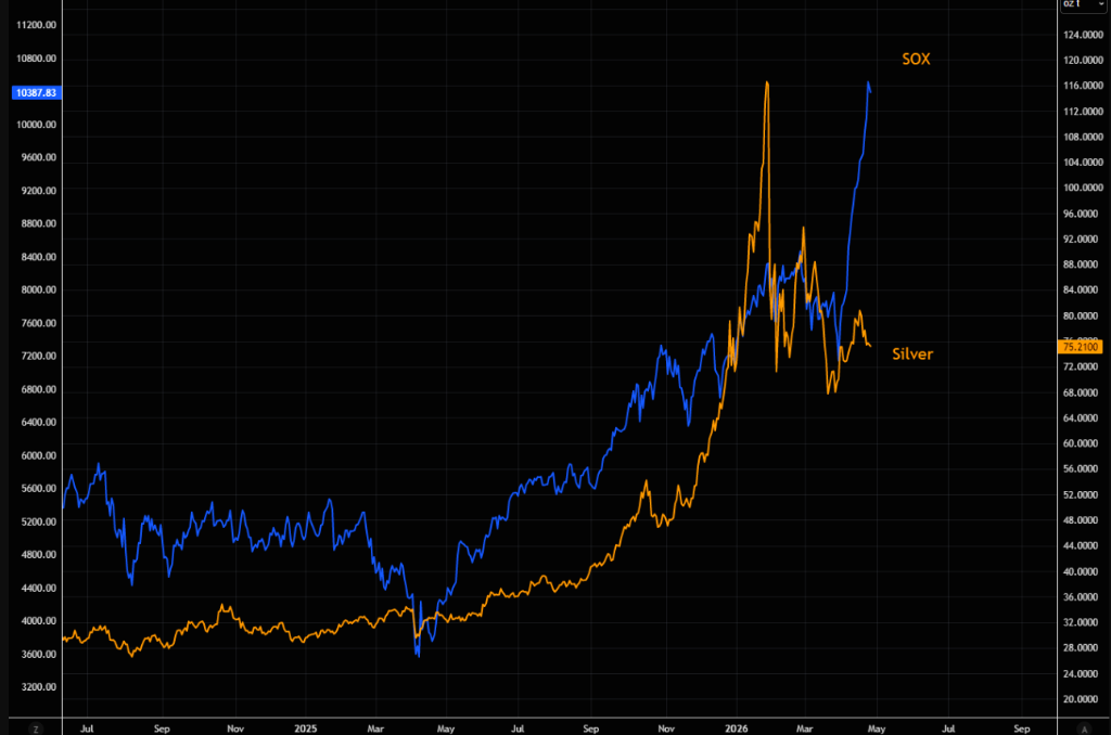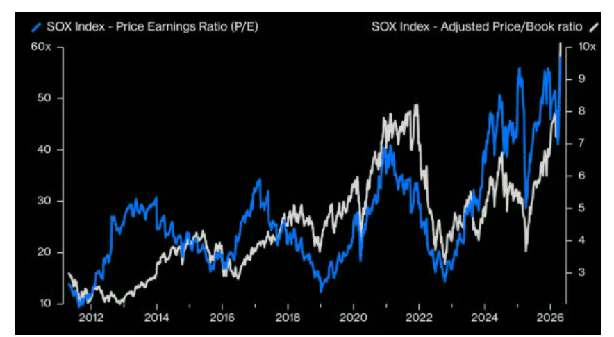 有分析指出,SOX与白银之间的估值差距悬殊。相比以60倍市盈率追涨SOX,追逐白银的上行凸性看起来更具吸引力。
