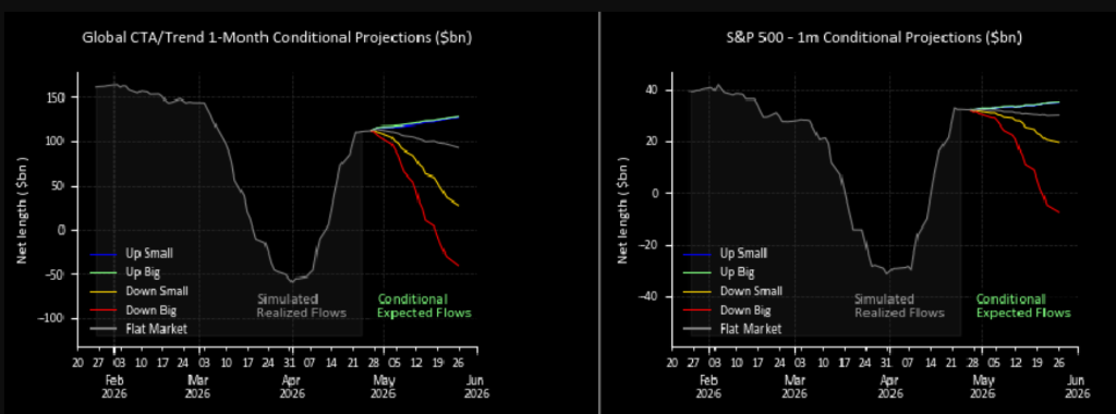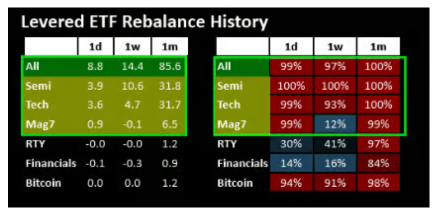 杠杆推波助澜。过去一个月,杠杆ETF再平衡贡献了约860亿美元的买盘,集中在半导体、科技和MAG,进一步强化了轧空行情。