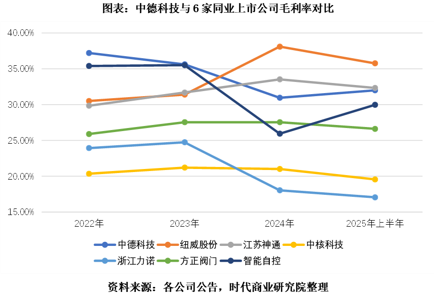 不过,时代商业研究院横向对比发现,2025年上半年,中德科技32.00%的综合毛利率处在可比上市公司平均线以上——低于纽威股份(35.76%)与江苏神通(32.33%),但高于中核科技(19.56%)、浙江力诺(17.06%)、方正阀门(26.62%)和智能自控(29.97%)。