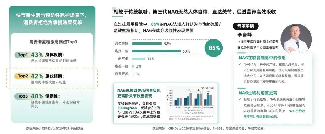 快节奏生活下,关节营养的高效直达成为关键诉求。传统氨糖短期见效不明显成为消费者氨糖使用中的Top3阻碍之一。NAG氨糖凭借3倍于传统氨糖的生物利用率实现“小剂量高吸收”,实验数据显示,每日服用500mg NAG氨糖的受试者在6周与12周的JOA改善率均显著优于1500mg传统氨糖组,精准匹配消费者对“快速见效与预防养护”的核心期待。