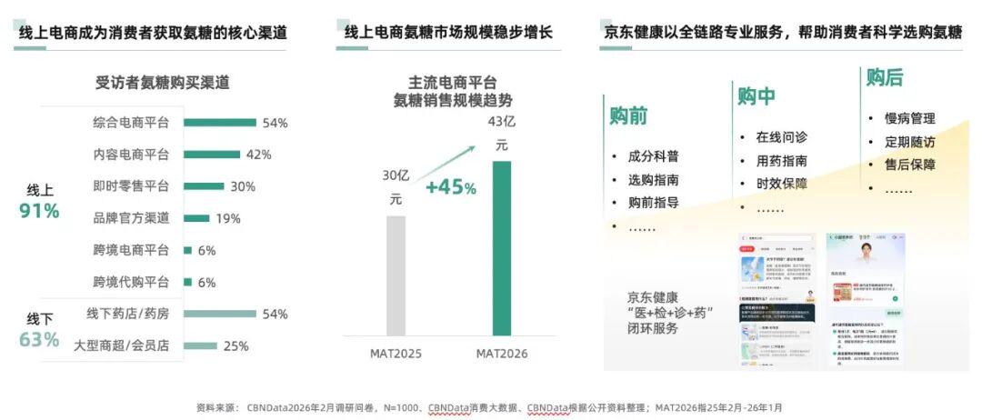 数字化浪潮下,氨糖消费加速向线上转移,主流电商平台氨糖市场规模达43亿元,同比增长45%。京东健康通过构建“购前科普、购中问诊、购后随访”的全链路专业服务,重塑线上健康消费场景,帮助消费者科学选购氨糖,推动线上渠道成为氨糖消费的核心阵地。