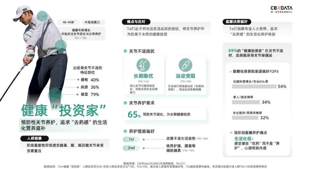 健康“投资家”多为40-49岁、中高消费力群体,将关节养护视为保障生活品质的健康投资。面对膝盖、腰椎、肩膀的早期变化,TA们通过改善不良姿势、使用辅助器具等方式主动预防。在氨糖信息获取上,信任专业人士推荐。TA们最突出的痛点在于养护方式不够日常——感觉像在吃药而非日常滋补,这种排斥感与他们对生活化养护的追求形成落差。