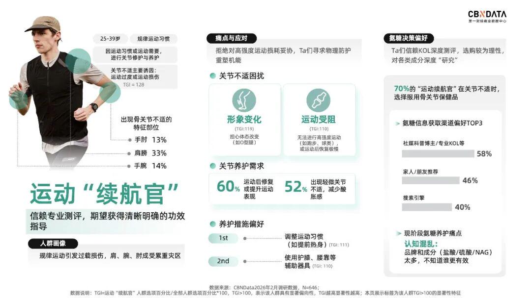 急需外源补充的中老年乐活派、需填补损伤的运动续航官、长期劳损致关节亚健康的职场撑腰人以及未雨绸缪预防关节问题的健康投资家,共同延展出了氨糖消费人群的多元图谱。