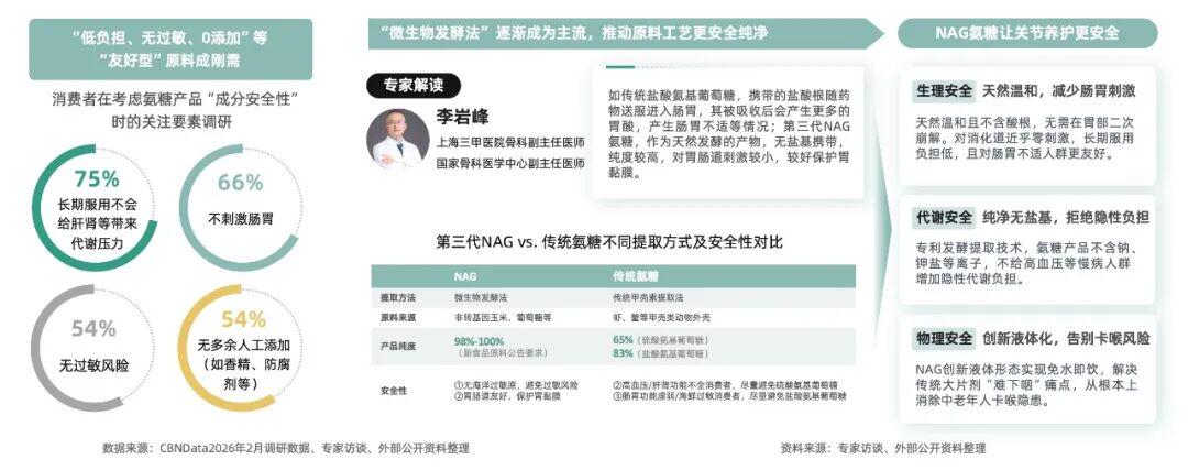 消费者对氨糖安全性的关注集中于肝肾代谢压力、肠胃刺激及过敏风险。传统氨糖多从虾蟹壳提取,易引发过敏与肠胃不适。NAG氨糖则创新采用微生物发酵法,从源头杜绝海鲜过敏原,不含钾钠离子对血压血糖更友好,天然温和,无胃肠刺激。此外,NAG氨糖还采用了液体剂型,口感更好,能有效降低中老年人群卡喉风险,让养护更安全、更安心。