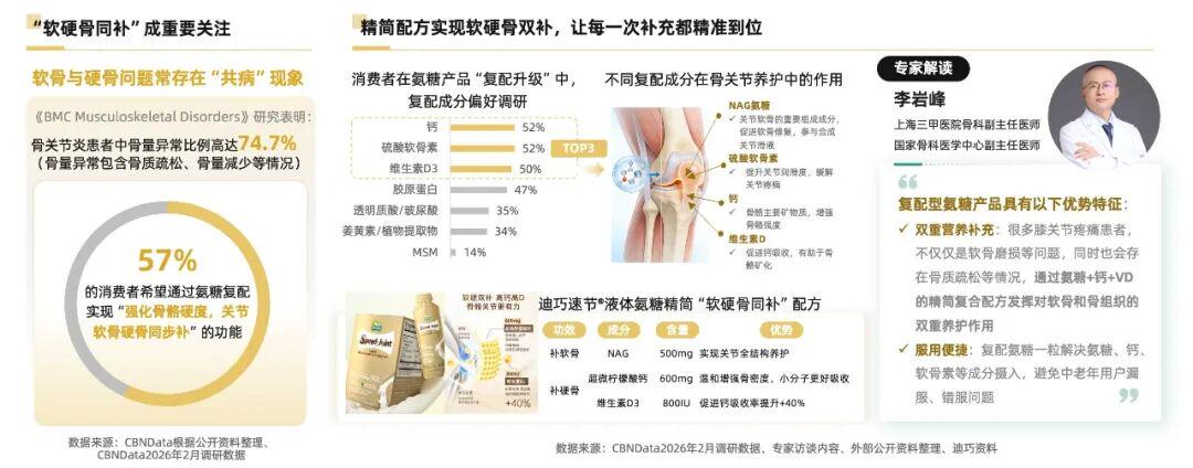 以迪巧速节®液体氨糖为例,其以天然NAG为核心,搭配钙与维生素D,配方高效精简,精准实现“软骨+硬骨”高效养护。专家指出,复配氨糖不仅能补充软骨营养,也能兼顾骨质疏松等硬骨问题,提升服用便捷性,避免漏服错服。