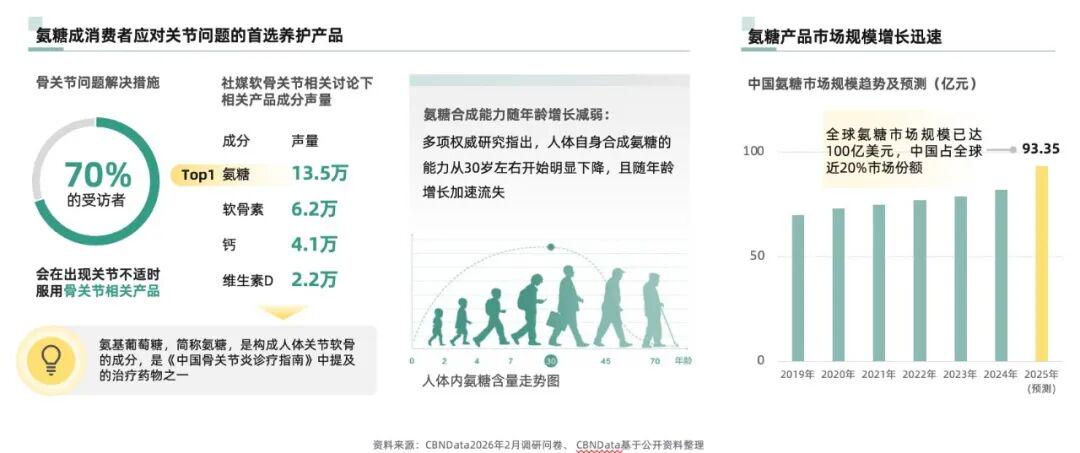 随着健康管理意识的提升,当前氨糖消费正从“单一需求”向“全面营养”升级,半数以上消费者希望通过复配实现“关节软硬骨同补”,让每一次补充都精准到位。