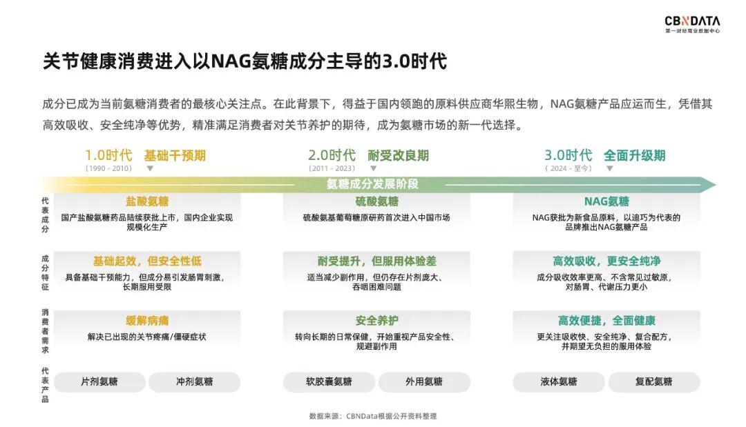 从以缓解病痛为目的1.0功效主导时代,到追求关节的长期保健的2.0兼顾安全时代,如今关节养护已迈入以液体氨糖为代表、NAG氨糖成分主导的3.0全面升级新阶段。告别1.0时代高纯度但易引发肠胃刺激和2.0时代相对温和但片剂庞大吞咽困难的痛点,3.0时代通过NAG液体氨糖的方式,找到了成分吸收率高、肠胃及代谢压力更小的高效便捷方案。
