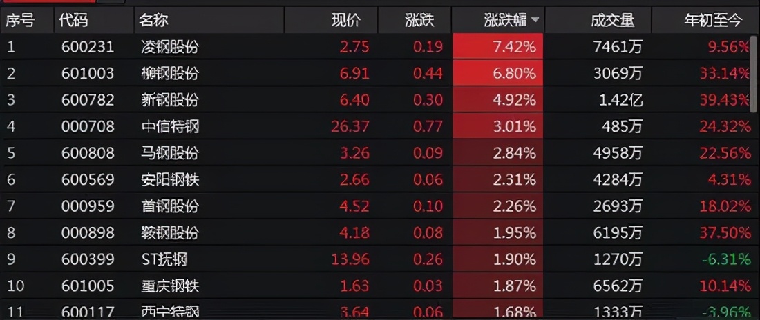 成分股方面,凌钢股份(2.750, 0.19, 7.42%)、柳钢股份(6.910, 0.44, 6.80%)、新钢股份(6.400, 0.30, 4.92%)等涨幅居前。