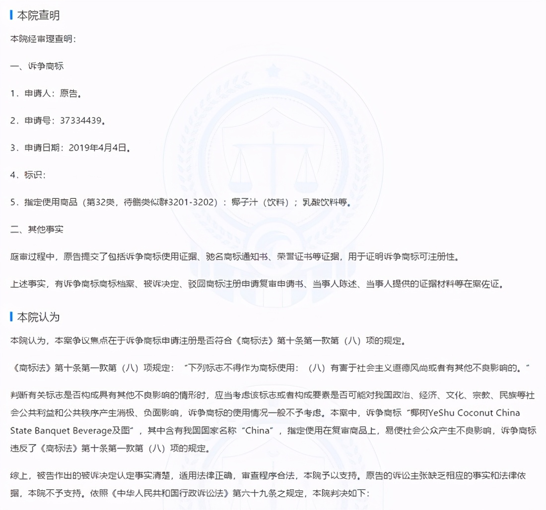 法院认为,本案中,诉争商标“椰树YeShu Coconut China State Banquet Beverage及图”,其中含有我国国家名称“China”,指定使用在复审商品上,易使社会公众产生不良影响,诉争商标违反了《商标法》第十条第一款第(八)项的规定。