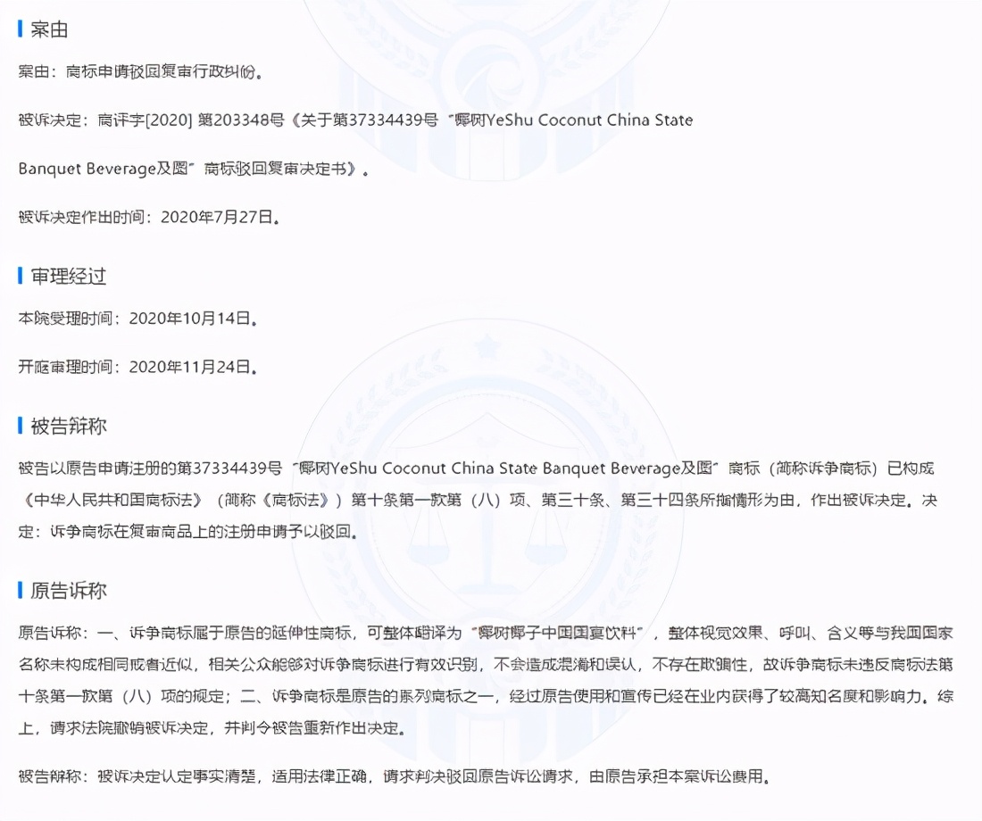 该判决书显示,原告诉称,诉争商标(“椰树YeShu Coconut China State Banquet Beverage及图”商标)属于原告的延伸性商标,可整体翻译为“椰树椰子中国国宴饮料”,整体视觉效果、呼叫、含义等与我国国家名称未构成相同或者近似,相关公众能够对诉争商标进行有效识别,不会造成混淆和误认,不存在欺骗性;诉争商标是原告的系列商标之一,经过原告使用和宣传已经在业内获得了较高知名度和影响力。综上,请求法院撤销被诉决定,并判令被告重新作出决定。