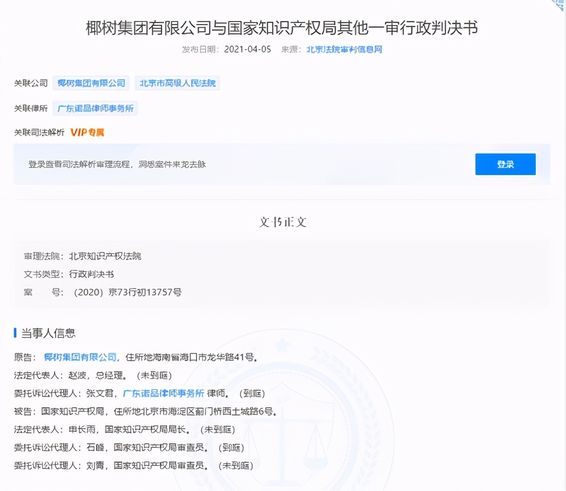 天眼查App显示,4月5日,椰树集团有限公司与国家知识产权局其他一审行政判决书公布,原告为椰树集团有限公司,被告为国家知识产权局,案由为商标申请驳回复审行政纠纷。案号为(2020)京73行初13757号,审理法院为北京知识产权法院。
