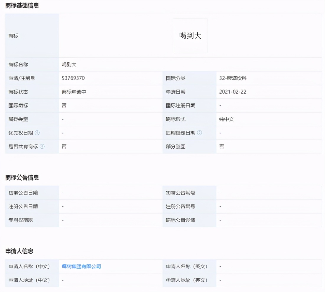 值得注意的是,根据天眼查商标信息,椰树集团有限公司还于今年2月分别申请了“从小”“喝到大”商标,国际分类为啤酒饮料,商标状态为“商标申请中”。