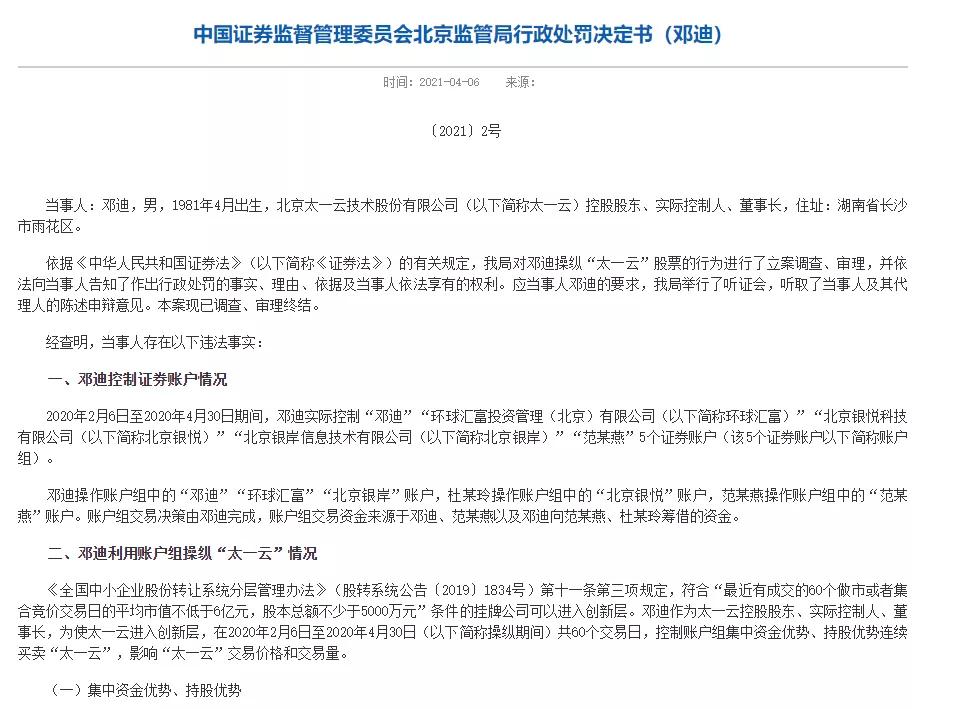 北京证监局的上述行政处罚决定书显示,当事人邓迪为北京太一云技术股份有限公司(以下简称太一云)控股股东、实际控制人、董事长。