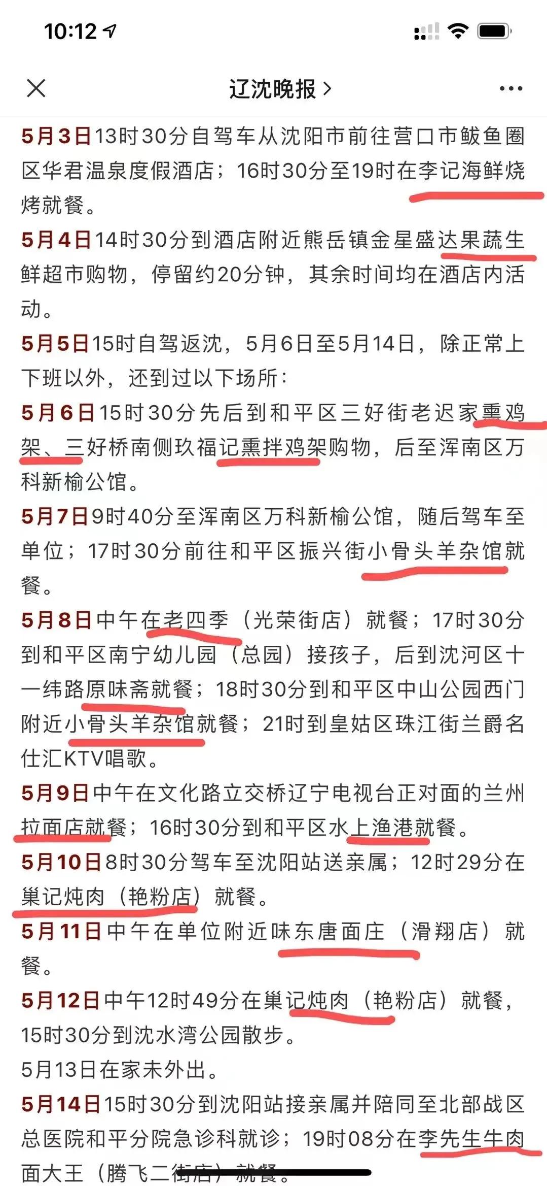 根据流调显示,这位沈阳大爷退休,因能力优秀被医院返聘,但是业余生活丰富,五一假期期间去鲅鱼圈自驾游,回到沈阳后,天天下馆子,鸡架、炖肉、抻面一个不落,每天还不重样。晚上21:00还会去KTV唱歌……