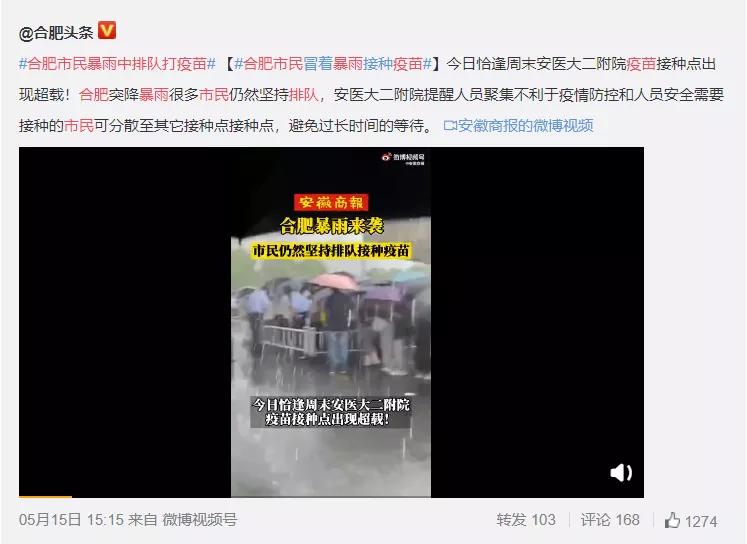 疫情出现后,合肥市民接种疫苗意愿强烈,连续两天刷新合肥单日接种量最高纪录。5月15日,#合肥市民暴雨中排队打疫苗#也一度冲上热搜。