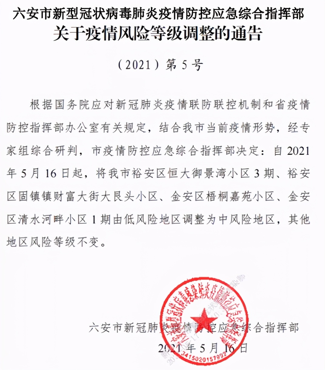 5月17日,安徽六安市卫健委官网发布消息,16日起,安徽六安4小区调整为中风险地区。