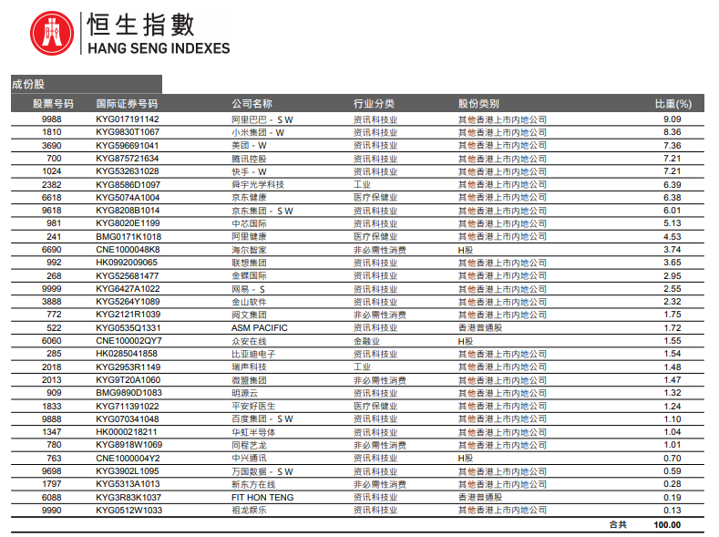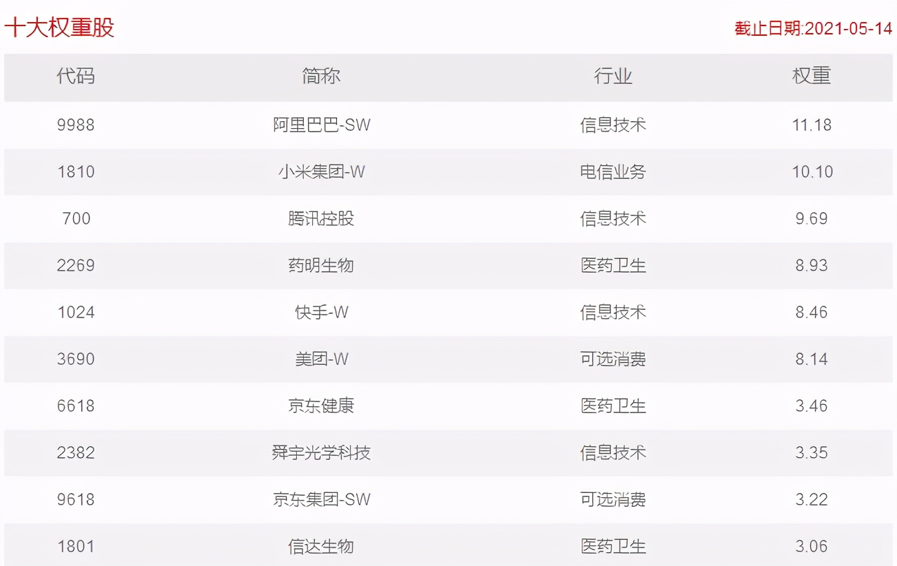 中证香港科技指数前十大重仓股则为:阿里巴巴-SW、小米集团-W、腾讯控股、药明生物、快手-W、美团-W、京东健康、舜宇光学科技、京东集团-SW、信达生物。