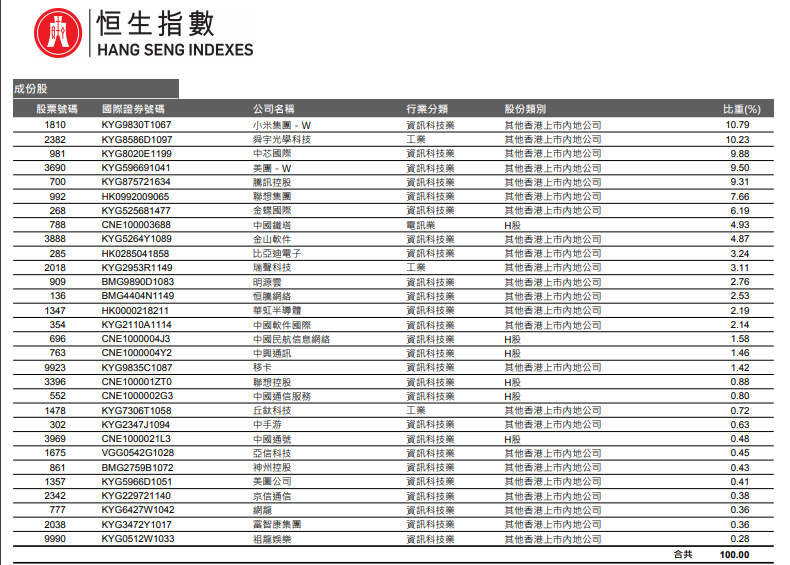 腾讯控股、小米集团等一些港股科技类龙头公司都出现在上述4大指科技数之中。