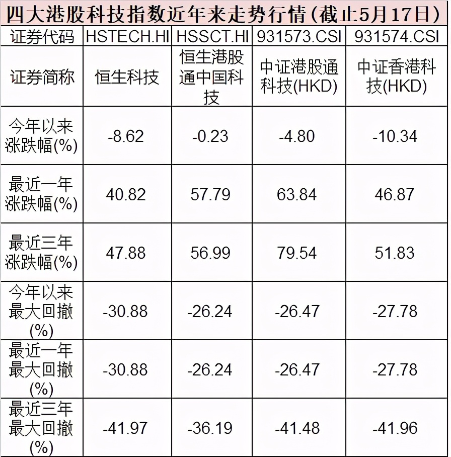 从今年以来的行情走势上看,恒生港股通中国科技指数表现较好,截止5月17日,指数微跌0.23%,而对比最近一年以来的市场表现,中证港股通科技指数以63.84%的表现暂居前列。