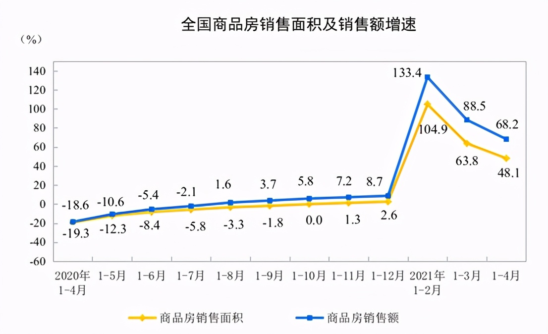 同日公布的《2021年1-4月份全国房地产开发投资和销售情况》则显示,今年前4月,全国房地产开发投资40240亿元,增速环比下跌4个百分点,已是连续第二个月环比下跌;全国商品房销售额53609亿元,增长68.2%,增速环比下跌明显, 达到20.3个百分点。