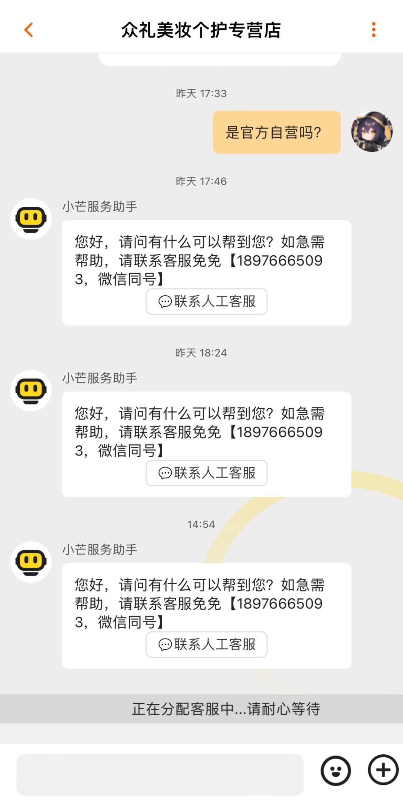 枝枝表示,自己前一天咨询的问题久久未分配到人工客服,而当第二天点进咨询页面,仍是“正在分配客服中”,由此自己也打消了购买的想法。