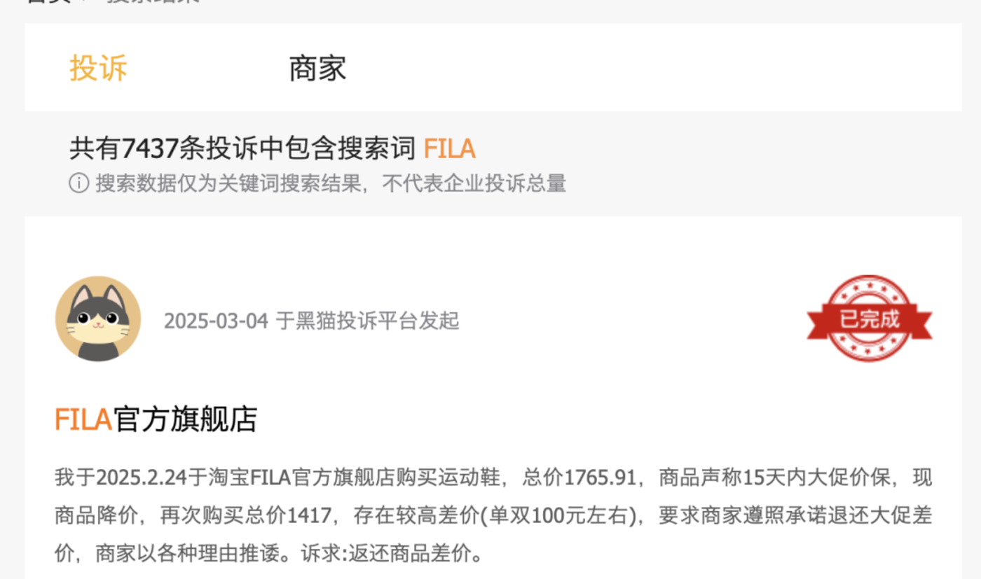 2024年双11期间,FILA在线上销售亮眼,分别在天猫和抖音的运动鞋服类目的第二名。但伴随着FILA受到的关注度增加,FILA被消费者提出的要求也在逐步提高。截至2025年3月20日,在黑猫投诉上,关于FILA的投诉数量为7436条,关于斐乐的投诉5950条。其中不乏涉及FILA裤子、衣服和鞋子的质量问题;售后服务方面也出现大量的投诉,可见FILA在售后服务环节依然有提高的空间。