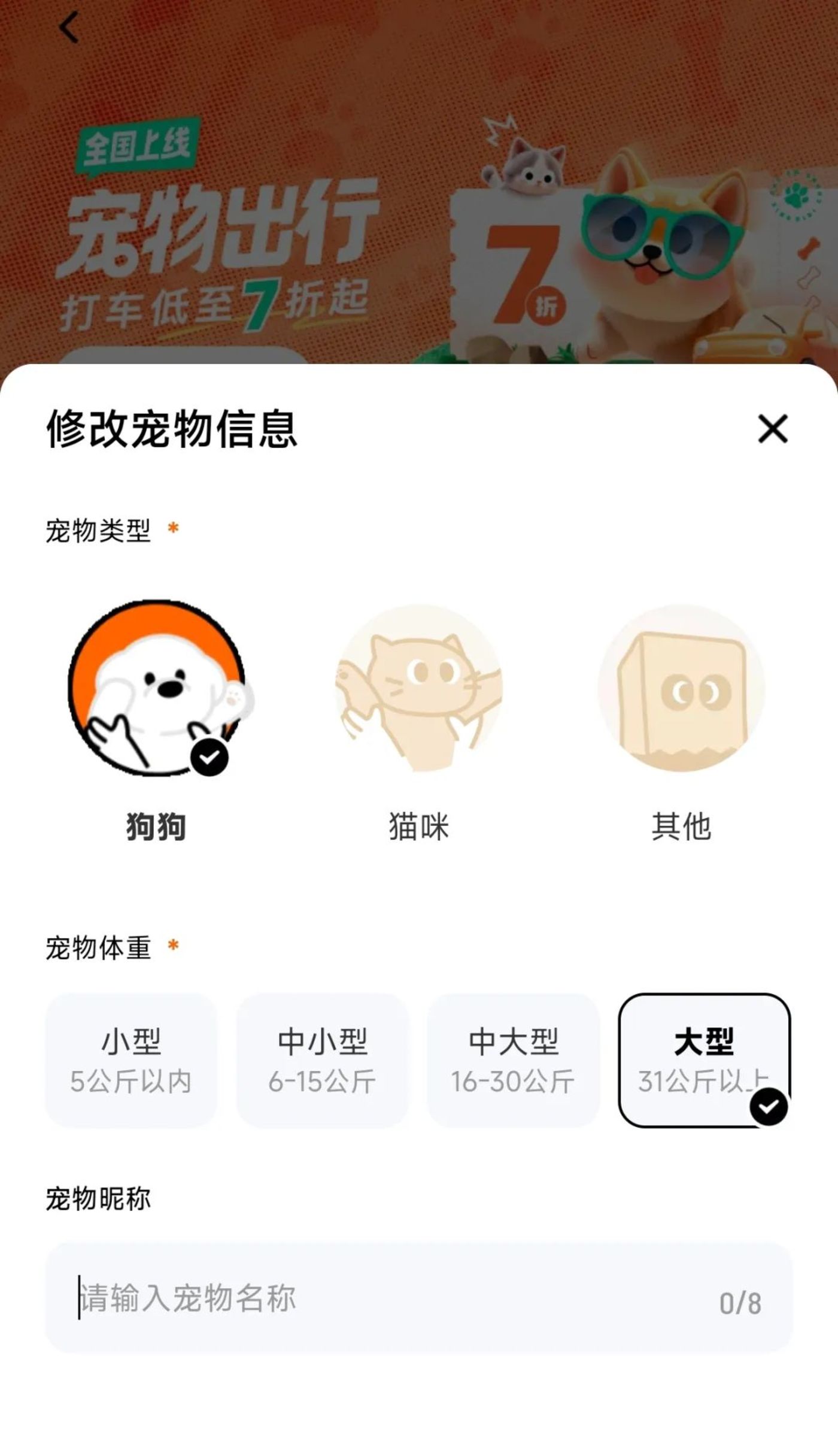 潘哥发现,使用宠物出行的乘客,打车前需选择宠物类型,分为狗、猫和其他,宠物体重分为四档;是否携带航空箱、宠物包,则影响着打车价格。