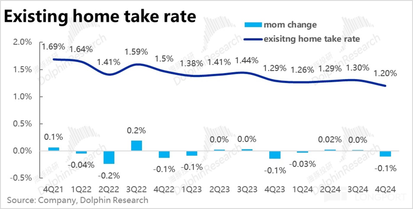不过,由于公司主动降低了自营存量房业务的抽佣率,环比小幅下降 0.1pct(可能出于降低交易成本刺激成交,也不排除有监管因素),存量房业务的营收同比增长了 47%,小幅跑输 GTV 增速。