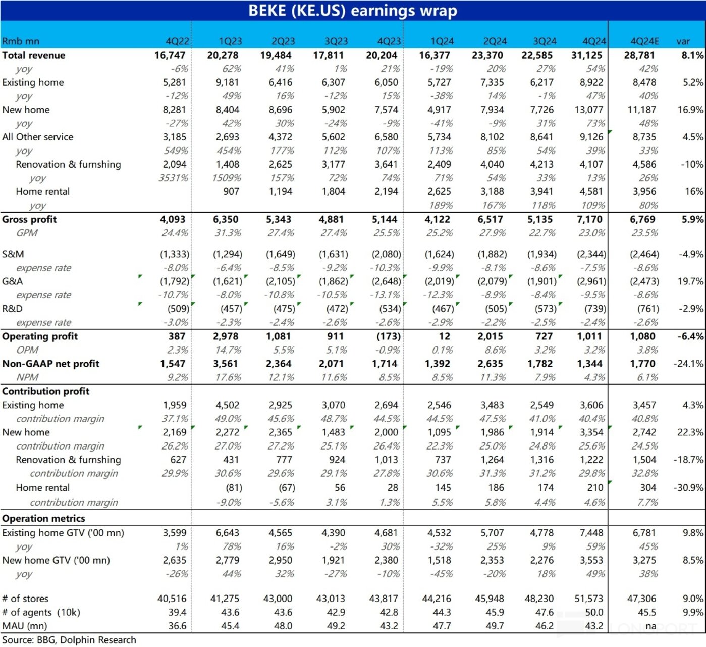 北京时间 3 月 18 日晚美股盘前,$贝壳.US 公布了 2024 年 4 季度财报。整体来看此次业绩表现可总结为,政策利好下暴涨式的规模增长 + 仅增速不增利,弹性甚至为负的利润,具体要点如下: