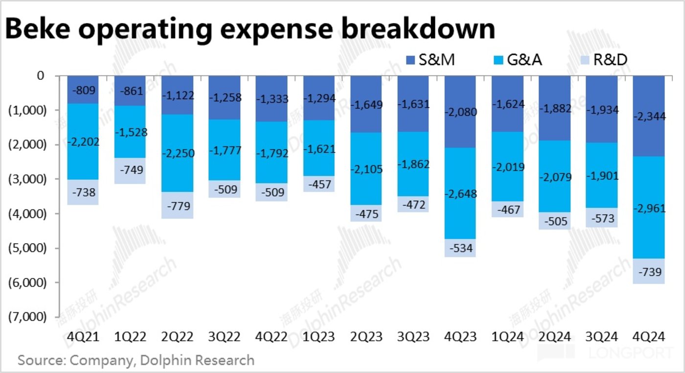 费用层面,本季贝壳三费合计较上季度增长了 40%,反而稍高于营收环增 38% 的幅度。同样呈现出,暴涨的业务和营收规模,并没有带来费用率的稀释和规模效应。反而由于公司更激进、乐观的投入态度,导致经营三费费率环比提升了 0.3pct。其中,研发费用同比增长约 38%,是投入增长最多的费用项。