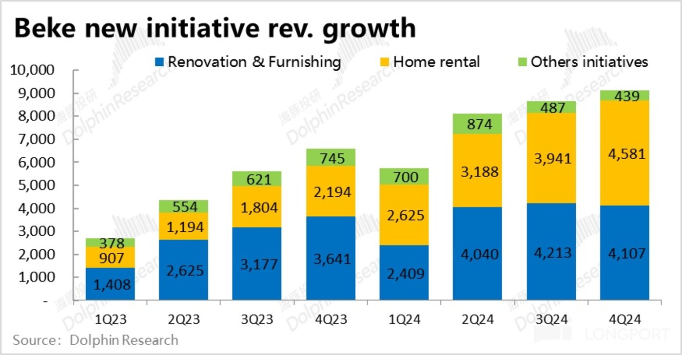 租赁业务则继续高速增长,本季营收达 45.8 亿,已超过家装业务,环比增速达 16%。不过由于本业务的大部分收入需要转移给房东,贡献利润率仍不超过 5%。从盈利角度看,重要性仍低于家装业务。