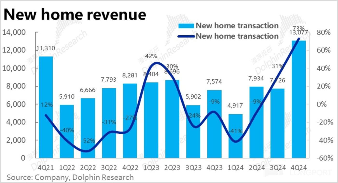 贝壳的新房业务增长也同样强劲,成交额同比增长了 49%,到 3553 亿,比市场预期多出约 280 亿(8.5%)。相较而言,全国百强房企在 4Q 的操盘成交额同比增速是从上季度-29% 改善到 0%,贝壳则是由 18% 改善到 49%。可见贝壳相比市场的改善幅度是大体一致的,但绝对表现依旧显著领先行业(合作房企和项目更优质)。但是高频数据来看,今年头两个月,新房市场的销售势头稍有下滑,没有存量房那么坚韧。
