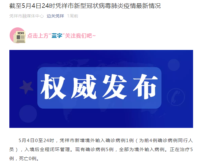 据边关凭祥微信公众号此前通报,5月4日0至24时,凭祥市新增境外输入确诊病例1例(为前4例确诊病例同行人员),入境后全程闭环管理。现有确诊病例5例,全部为境外输入病例。正在治疗5例,死亡0例。