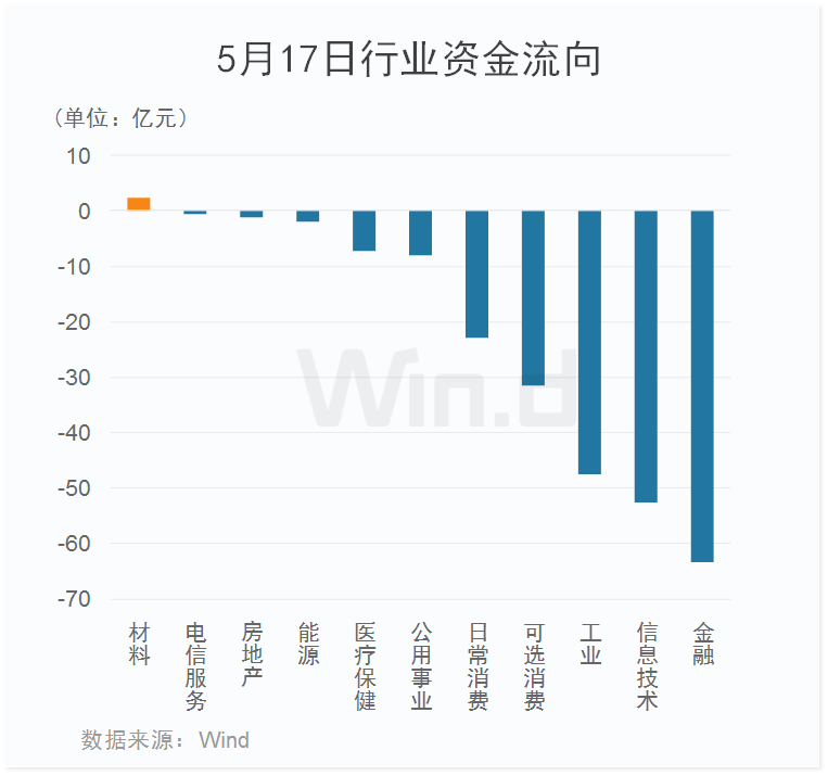从5月17日行业资金流向来看,主力资金净流出200多亿元,其中金融板块净流出超过60亿元,位于首位;信息技术、工业、可选消费板块净流出金额亦较高,均超30亿元;仅材料板块小幅净流入。