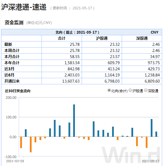 5月17日,北上资金净流入25.78亿元,前一交易日则净流入90亿元。本月以来,北上资金仅小幅净流入58.55亿元,短期来看,北上资金的变动趋势并不明显。