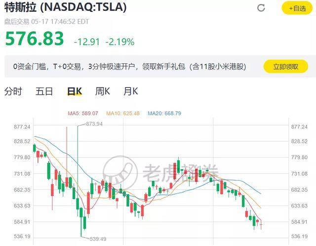 卷入比特币争议的 特斯拉一度下跌4.8%,最终收跌2.2%,每股报576.83美元, 较1月下旬所创逾900美元的纪录高位回落36%,近4个月时间 市值蒸发3116亿美元,约合人民币2万亿元,目前总市值5557亿美元。