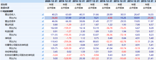 来自wind数据显示,纵观南国置业近十年来的业绩,增收不增利已经成为常态。公司营业收入从2011年的10亿元增长到了2020年的40亿元,但净利润却从2.94亿元下降到了0.33亿元。?