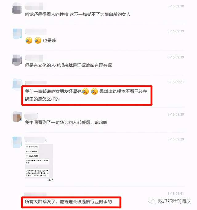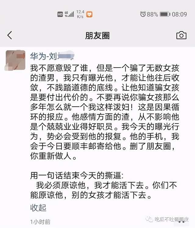 昨天早上,华为员工刘XX的女友陈X用刘XX的手机在朋友圈发出千字长文,控诉自己男友 出轨、骗P、甚至家暴 等……并通知华为及各大通信群围观。