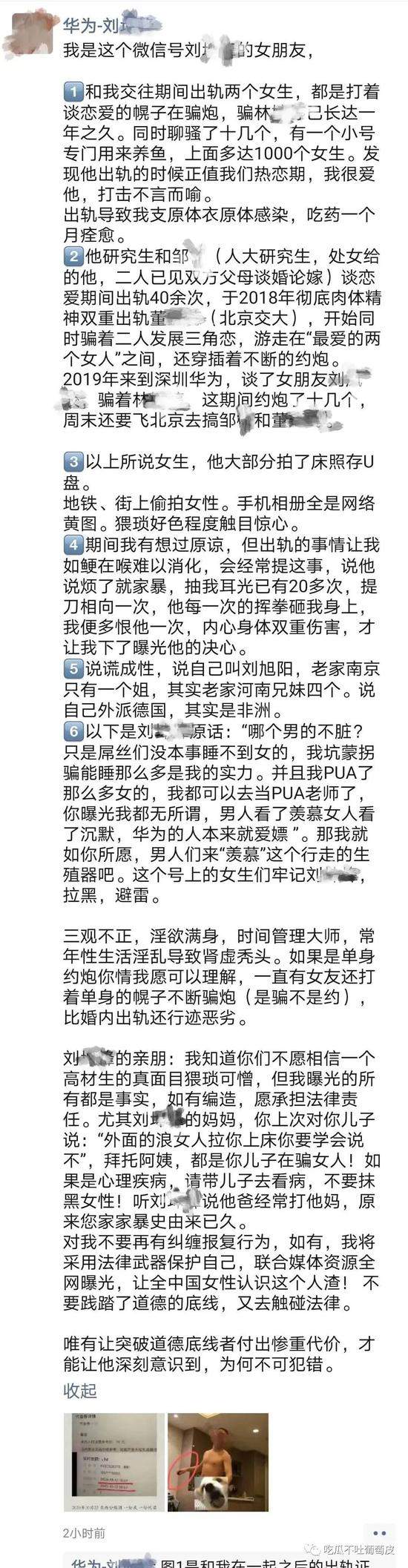 以下是刘xx原话:“哪个男的不脏?只是屌丝们没本事睡不到女的,我坑蒙拐骗能睡那么多是我的实力。并且我PUA了那么多女的,我都可以去当 PUA老师了,你曝光我都无所谓,男人看了羡慕女人看了沉默,华为的人本来就爱嫖”。那我就如你所愿,男人们来“羡慕”这个行走的生殖器吧。这个号上的女生们牢记刘xx,拉黑,避雷。