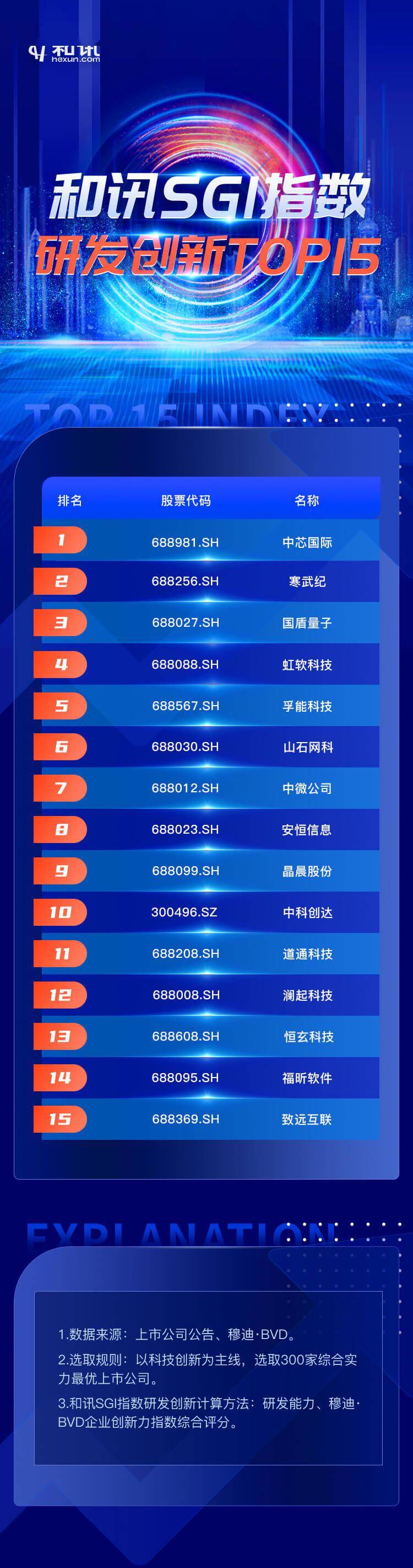 5月18日,和讯SGI指数研发创新TOP15出炉!中芯国际、寒武纪、国盾量子、虹软科技等上市公司上榜。