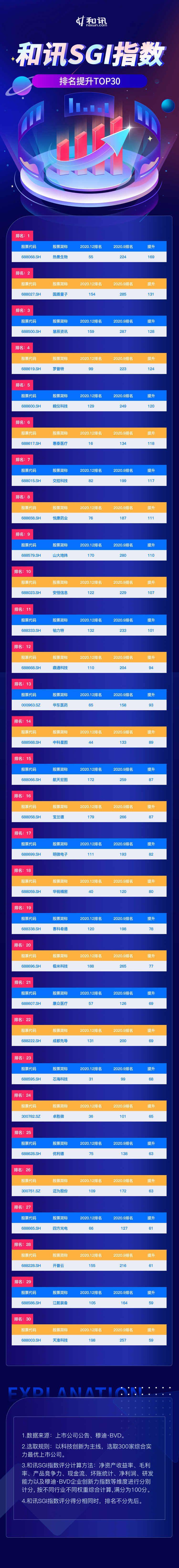 5月18日,和讯SGI指数评分排名提升TOP 30名单出炉,上榜的上市公司有热景生物、国盾量子、皖仪科技、华东医药、明微电子、开普云、天准科技等,排名提升幅度为59个名次到169个名次不等。其中,热景生物排名上升169个名次挺进总榜第55名。此外,惠泰医疗排名上升118个名次冲进总榜第16名。
