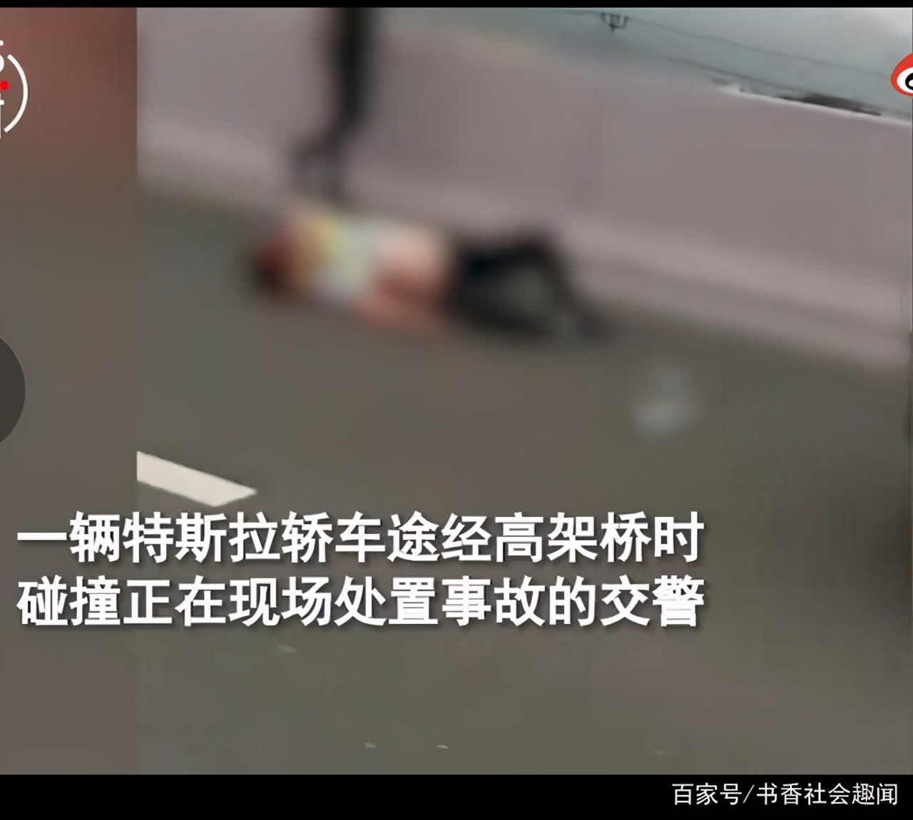 事故视频显示,高架桥两名交警倒在地上,一辆黑色特斯拉轿车车头受损。