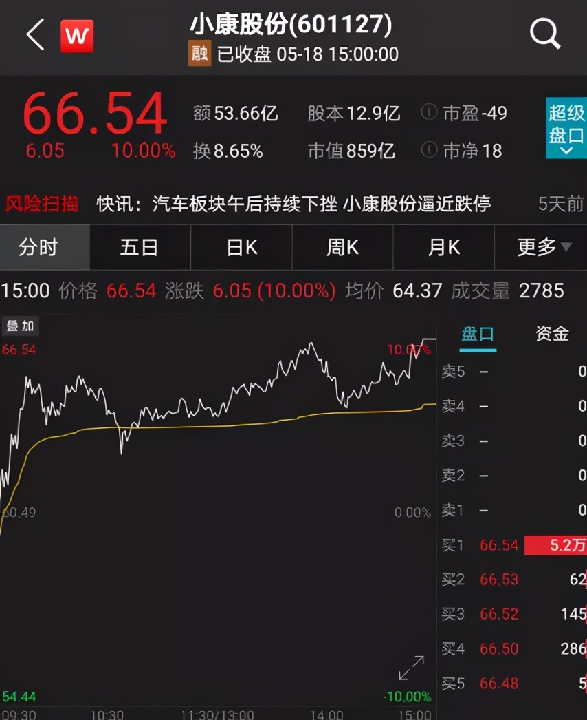 小康股份尾盘再度涨停,成交额超53亿元。最新股价为66.54元每股,市值为859亿元。