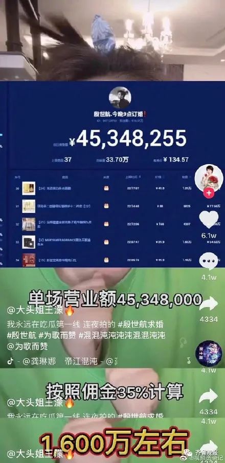 另有网友爆料,殷世航16日五个小时销售额4500万,如果按照平台抽佣35%的佣金比例来算的话,他当晚赚了1600万。