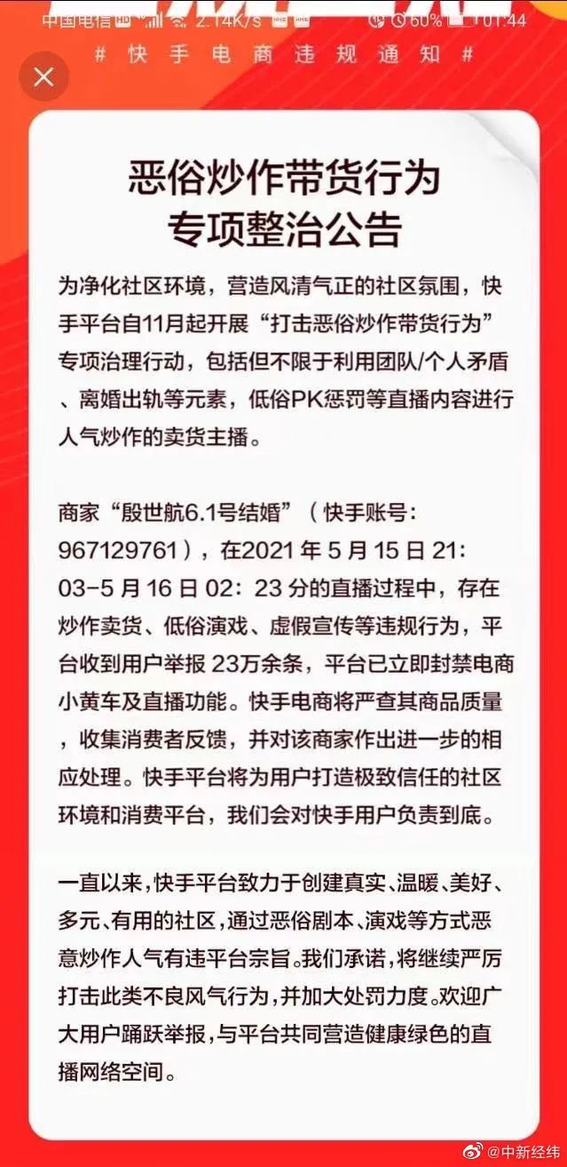 17日上午,快手电商官方微博发布违规通知称,商家“殷世航6.1结婚”在2021年5月15日21:03—5月16日02:23分的直播过程中,存在炒作卖货、低俗演戏、虚假宣传等违规行为。平台接到用户23万条举报,目前已经对殷世航账号进行封禁处理。快手电商将严查其商品质量,收集消费者反馈,并对该商家作出进一步的相应处理。