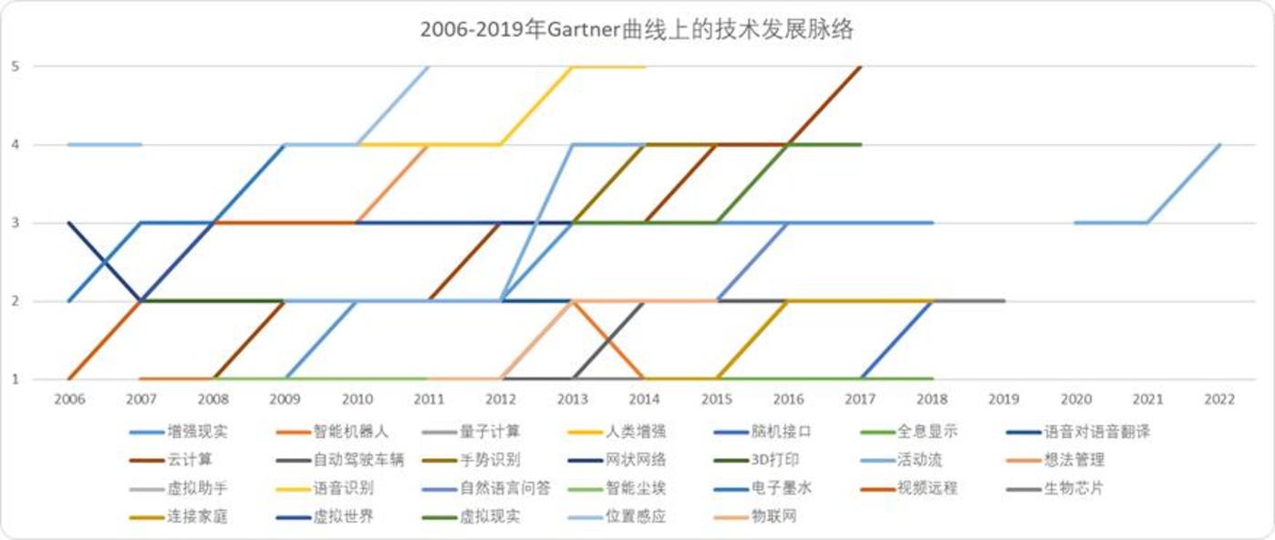 3)在这26个至少5次登上Gartner曲线的新兴技术中,能够延寻技术曲线各个阶段出现变化(迈入下一阶段)的,一共有19个左右。